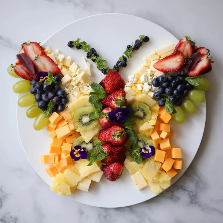 - Fan out the fruits, vegetables, and charcuterie on either side to create wings, using symmetry for a butterfly effect.