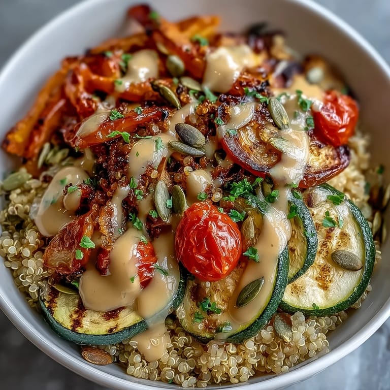 Save Welcome to a delightful Mediterranean-inspired feast that combines vibrant grilled vegetables, protein-packed quinoa, and a luscious tahini drizzle. These colorful power bowls represent the perfect balance of nourishment and flavor—each component working in harmony to create a satisfying meal that energizes both body and spirit. The smoky char of the vegetables contrasts beautifully with the nutty quinoa and creamy tahini sauce, creating layers of texture and taste in every bite.
