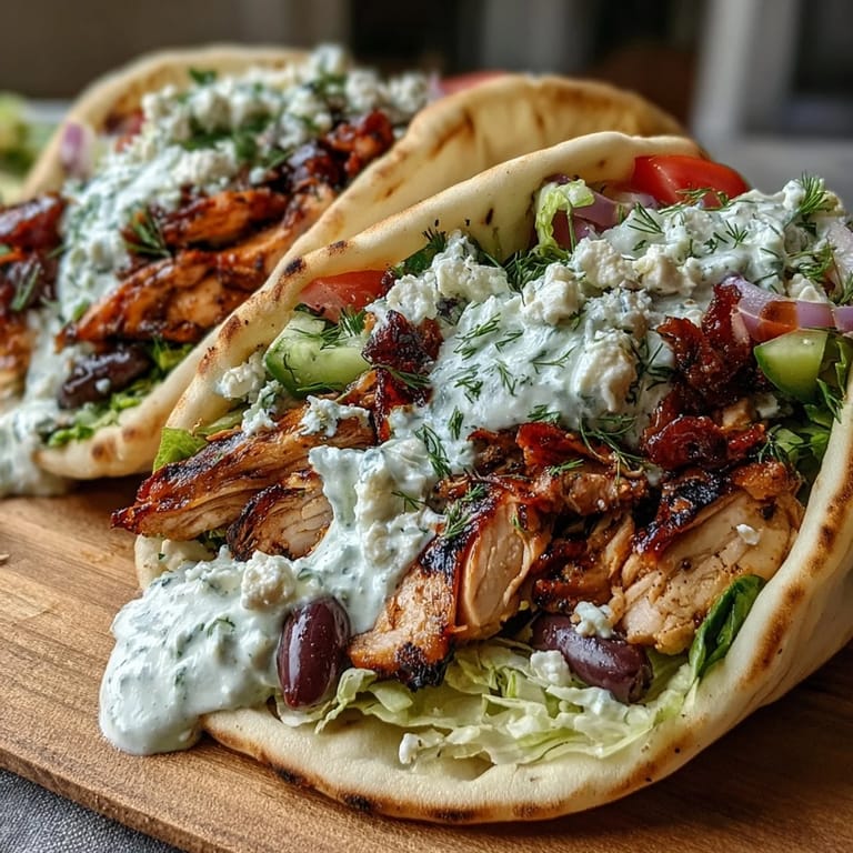 - Lay a warmed pita on a plate, spread a generous spoonful of creamy feta tzatziki in the center, and top with shredded lettuce, diced tomatoes, red onion slices, and Kalamata olives. Pile on the sliced chicken, drizzle with extra tzatziki, and garnish with fresh parsley or mint leaves.