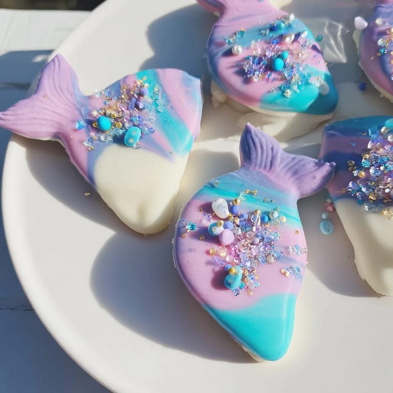 Save Delicate, mermaid tail-inspired petits fours featuring colorful, airy madeleines with a hint of vanilla, dipped in white chocolate and adorned with shimmering sprinkles — perfect for refined afternoon teas or festive celebrations.