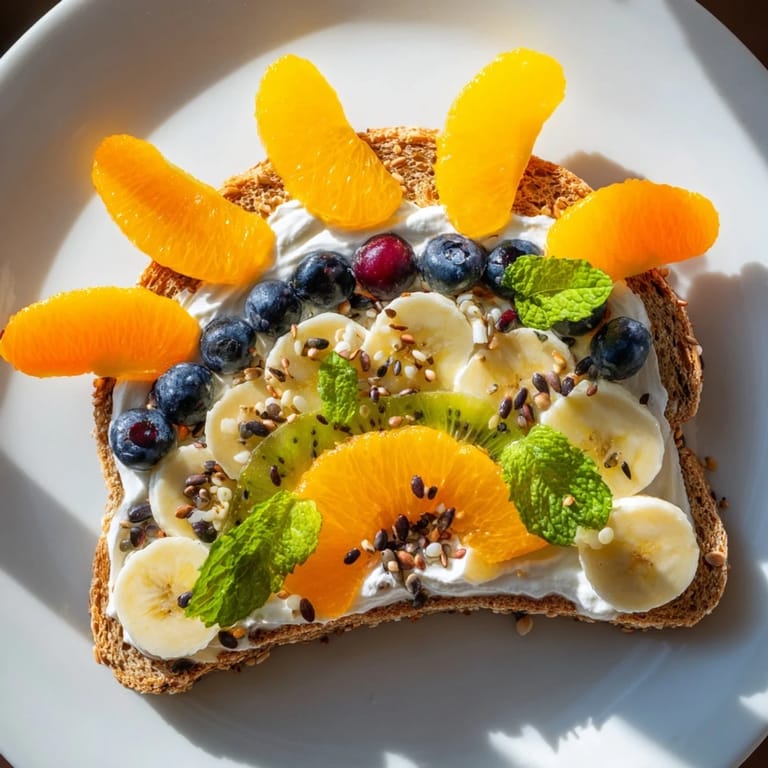 Save A vibrant and creative breakfast featuring beautifully decorated toasts inspired by the morning sun, perfect for starting your day with nutrition and a smile.