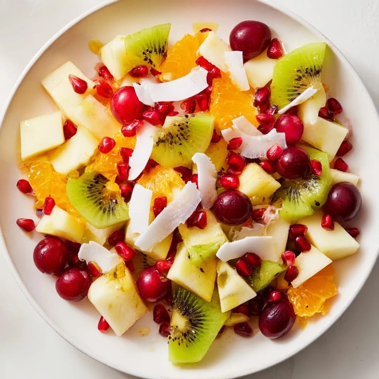 Save A refreshing winter fruit salad featuring a blend of seasonal fruits, tossed in a light citrus-honey dressing and topped with coconut flakes for a festive snow-like touch.