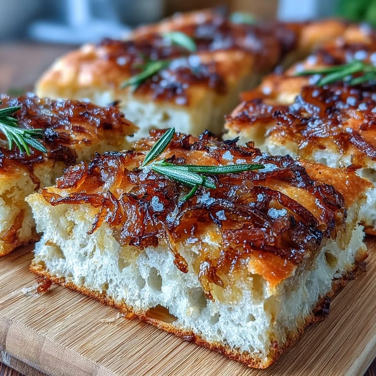 - Preheat your oven to 220°C (425°F), then use your oiled fingertips to gently press dimples all over the dough's surface—these are the signature focaccia texture and they also catch the toppings. Drizzle with a bit more olive oil, then scatter caramelized onions, flaky sea salt, fresh rosemary if using, and a crack of black pepper evenly across the top.