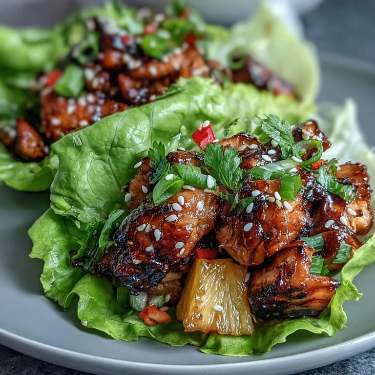 Save There's something about the moment a wooden spoon first hits hot oil in a wok that makes you feel like you're cooking something real. I discovered these lettuce wraps on a Tuesday when my fridge was half-empty and my mood needed lifting, so I threw together what I had: chicken, leftover pineapple from the weekend, and a desperate need to avoid another pasta night. The first bite changed everything—sweet glaze, crisp lettuce, that pop of fresh cilantro hitting all at once. Now they're my go-to when I want something that feels like I spent hours in the kitchen but actually took less time than ordering takeout.