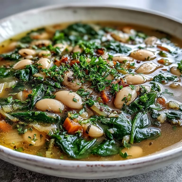 The soup simmers for exactly twenty minutes before you add the spinach, which is long enough for the beans to soften further and the herbs to really settle into the broth, but short enough that you're not cooking away all the brightness. When you add the spinach at the end, you're preserving its vivid color and subtle flavor instead of turning it dull and overcooked. This sequencing matters more than most recipes admit.